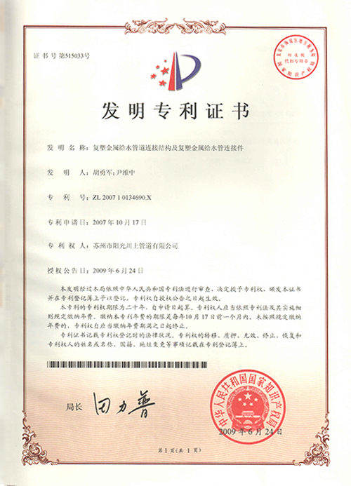 復(fù)塑銅管件發(fā)明專利證書-陽光榮譽