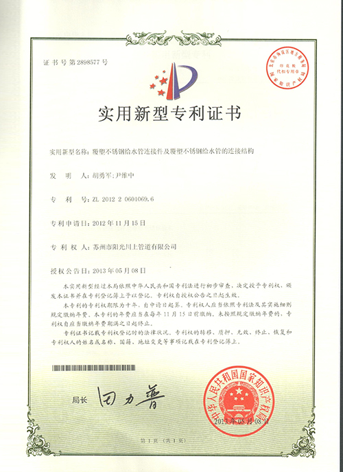 覆塑不銹鋼管件實用新型專利證書-陽光榮譽