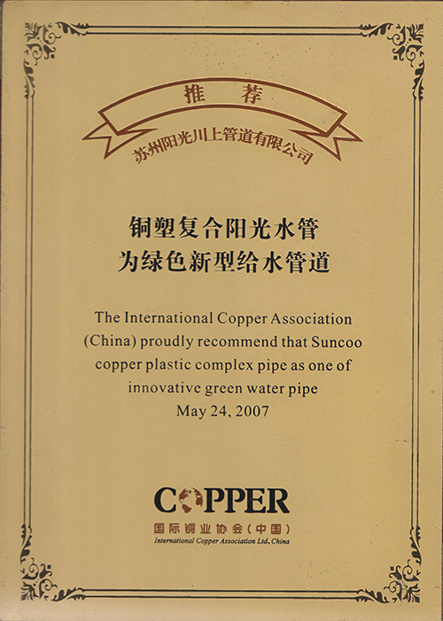 國際銅業(yè)協(xié)會推薦證書-陽光榮譽